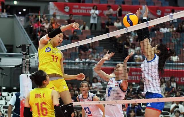 9月28日,中國隊球員顏妮(左上)在比賽中扣球。新華社記者 賀燦鈴 攝